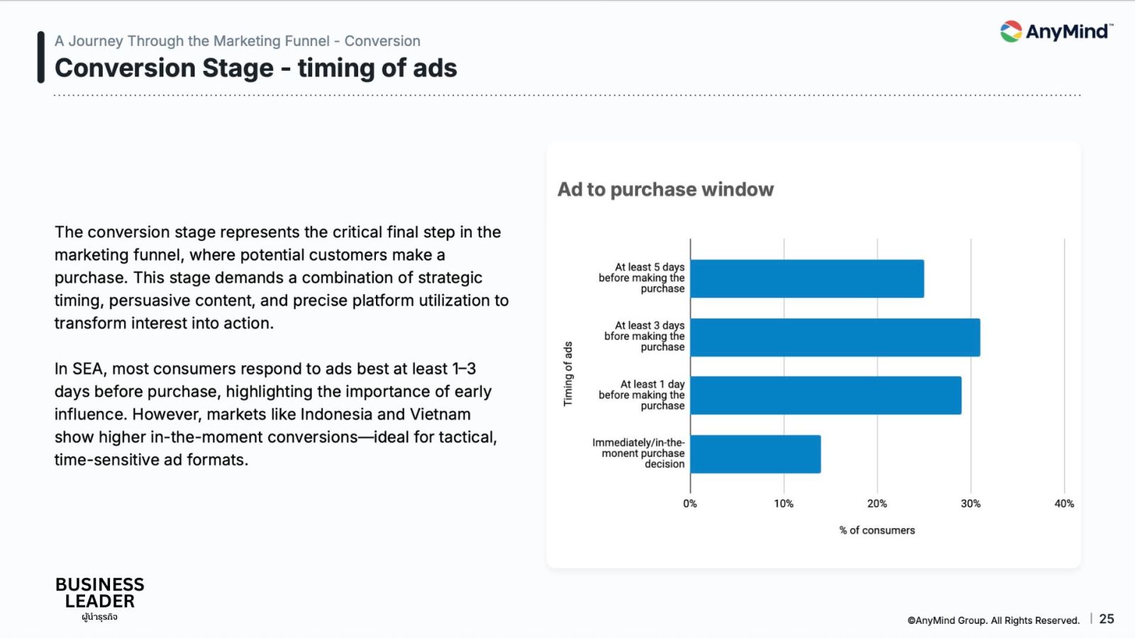 ผู้บริโภคทั่วเอเชียตะวันออกเฉียงใต้ตอบสนองต่อโฆษณาวิดีโอได้ดีที่สุดในช่วง 1–3 วันก่อนตัดสินใจซื้อ ช่วงเวลาเป็นปัจจัยสำคัญในการผลักดันให้เกิดการซื้อ โดยผู้บริโภคส่วนใหญ่ระบุว่าตนเองมีแนวโน้มเปิดรับโฆษณาวิดีโอมากที่สุดในช่วงเวลาก่อนตัดสินใจซื้อเพียงไม่นาน โดยเฉพาะในช่วง 1-3 วันก่อนการซื้อ ซึ่งถือเป็นโอกาสเชิงกลยุทธ์สำหรับแบรนด์ในการนำเสนอคอนเทนต์วิดีโอที่มีอิทธิพลสูงเพื่อกระตุ้นให้ผู้บริโภคเปลี่ยนจากความตั้งใจไปสู่การลงมือซื้อจริง โดยเฉพาะในตลาดอย่างมาเลเซียและฟิลิปปินส์ ซึ่งความสนใจในการคลิกชมโฆษณาอยู่ในระดับสูงที่สุดในช่วงเวลาดังกล่าว