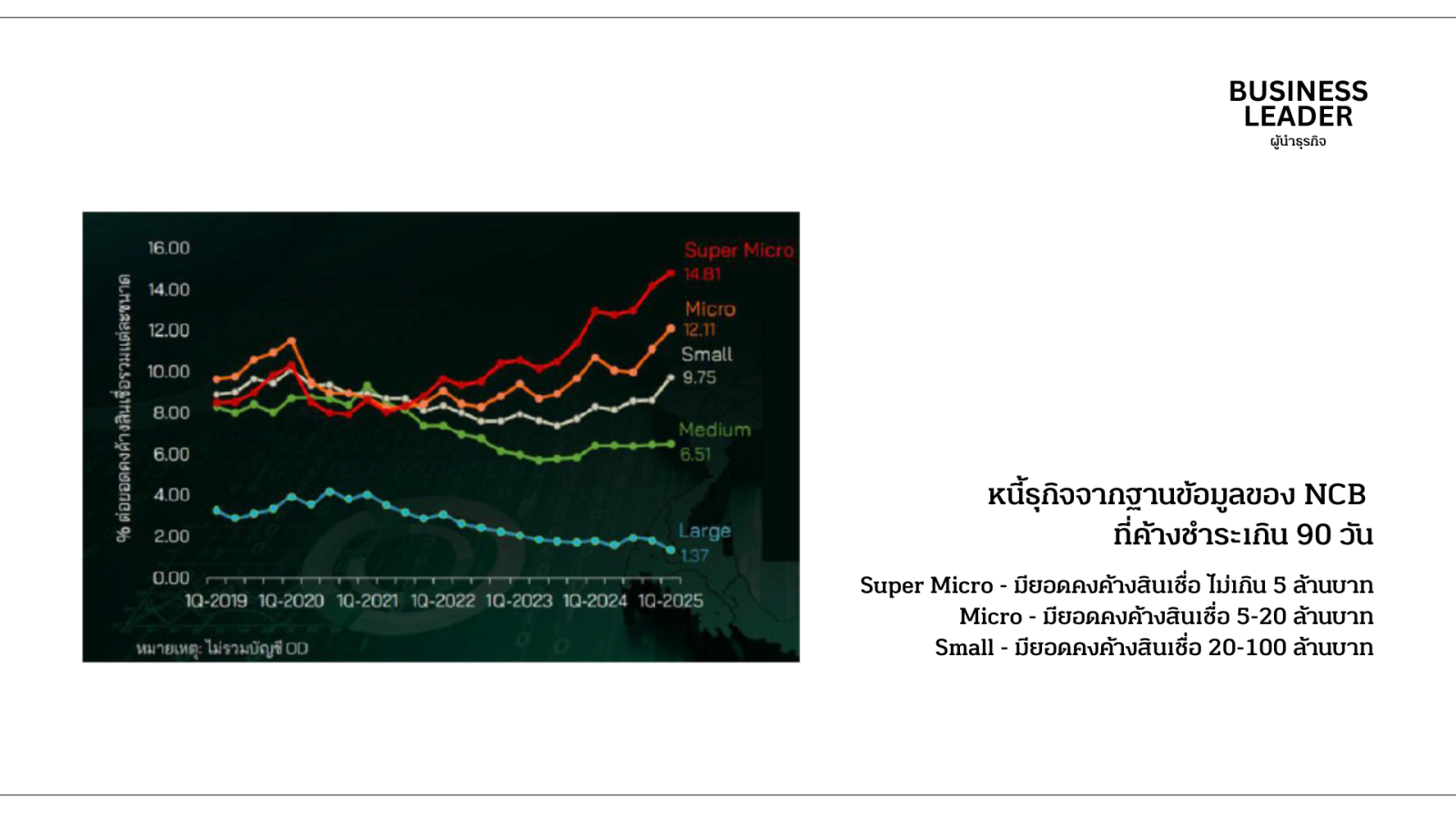 เศรษฐกิจไทยเริ่มเข้าสู่ภาวะชะลอตัว เศรษฐกิจไตรมาสที่สองขยายตัว 2.8% ลดลงจาก 3.2% ในไตรมาสที่หนึ่ง ส่วนอัตราการว่างงานในระบบในไตรมาสที่สองเพิ่มขึ้นเป็น 2.07% จาก 1.88% ในไตรมาสที่หนึ่ง และมีจำนวนผู้เสมือนว่างงานอยูที่ 2.1 ล้านคน สูงขึ้นราว 5% จากปีก่อน และภาคการท่องเที่ยว ภาคก่อสร้างและอสังหาฯ และภาคเกษตรชะลอตัว ความเปราะบางของ SMEs เห็นได้ชัดจากยอดค้างชำระหนี้เกิน 90 วันที่เพิ่มขึ้น โดยเฉพาะกลุ่ม SMEs ขนาดเล็กที่ยอดคงค้างสินเชื่อไม่เกิน 100 ล้านบาท
