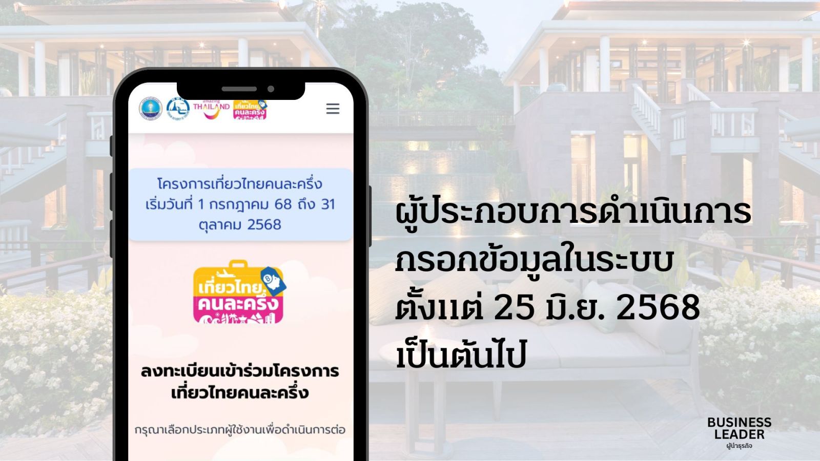 เริ่มลงทะเบียนผู้ประกอบการโครงการเที่ยวไทยคนละครึ่ง ตั้งแต่วันที่ 25 มิ.ย. 2568 เป็นต้นไป ขั้นตอนการเข้าร่วมโครงการเที่ยวไทยคนละครึ่ง
