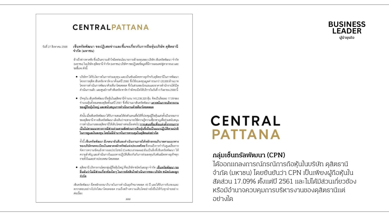 กลุ่มเซ็นทรัลพัฒนา (CPN) ออกแถลงการณ์อย่างเป็นทางการเกี่ยวกับกรณีการถือหุ้นในบริษัท ดุสิตธานี จำกัด (มหาชน) ท่ามกลางกระแสข่าวว่ามีความพยายามเข้าครอบงำหรือแทรกแซงการบริหารของดุสิตธานี โดยในถ้อยแถลงนั้น เซ็นทรัลได้ปฏิเสธอย่างหนักแน่นว่า การถือหุ้นในดุสิตธานีนั้นเป็นไปเพื่อโอกาสการลงทุนและการพัฒนาโครงการร่วมกัน ไม่ได้เป็นความมุ่งหมายที่จะเข้าควบคุมหรือเปลี่ยนแปลงโครงสร้างการบริหารของบริษัทแต่อย่างใด