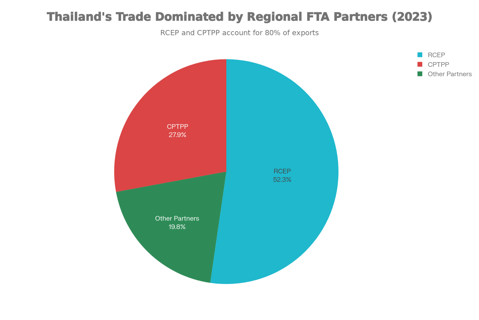 ความสัมพันธ์ทางการค้าของไทยกับกลุ่มเหล่านี้เผยให้เห็นการกระจุกตัวเชิงยุทธศาสตร์ ข้อมูลระบุว่า RCEP ครอบคลุมร้อยละ 52.3 ของการส่งออกไทย และร้อยละ 58.4 ของการนำเข้า ในขณะที่ CPTPP ครอบคลุมร้อยละ 27.9 ของการส่งออก และร้อยละ 25.4 ของการนำเข้า ส่วนที่เหลือร้อยละ 19.8 ของการส่งออกกระจายไปตามข้อตกลงทวิภาคีและคู่ค้าดั้งเดิม