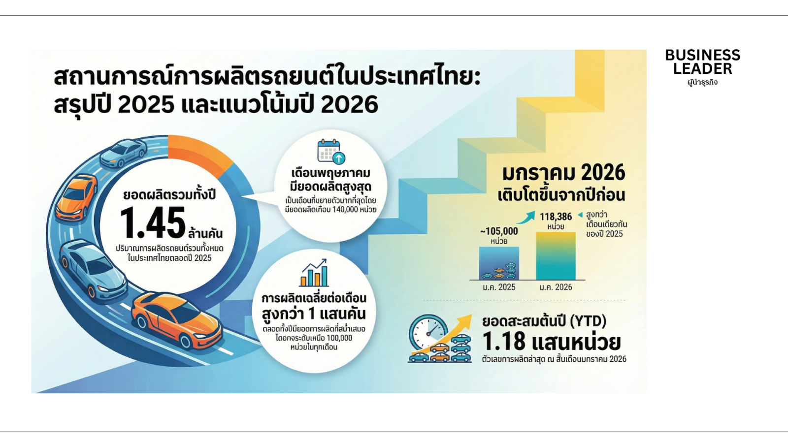 การเพิ่มขึ้นของ ยอดการผลิตรถยนต์ เดือนมกราคม 2569 ถือเป็นสัญญาณเชิงบวกที่ชัดเจนสำหรับการฟื้นตัวของ อุตสาหกรรมยานยนต์ไทย โดยเฉพาะอย่างยิ่งจากปัจจัยหนุนของการส่งออกรถยนต์นั่งและความต้องการรถกระบะในประเทศที่แข็งแกร่ง พร้อมกับการขยายตัวของตลาด EV ที่ยังคงเติบโตต่อเนื่อง เป็นการตอกย้ำถึงศักยภาพของไทยในการเป็นฐานการผลิตยานยนต์ที่สำคัญของภูมิภาค และเป็นแรงขับเคลื่อนเศรษฐกิจที่สำคัญต่อไปในปีนี้และในอนาคต.