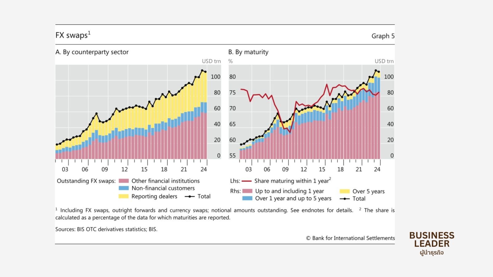 เหตุการณ์ yen carry trade ในเดือนสิงหาคม 2024 เป็นตัวอย่างที่โดดเด่นของการส่งผ่านแรงกระแทกทางการเงินภายในประเทศข้ามประเทศเศรษฐกิจหลัก แม้จะมีการดำเนินนโยบายการเงินที่เข้มงวดขึ้นของสหรัฐหลังโควิด เงื่อนไขทางการเงินในประเทศยังคงหลวมพอสมควร ซึ่งส่วนหนึ่งเกิดจากการส่งผ่านเงื่อนไขทางการเงินที่ง่ายขึ้นจากญี่ปุ่นไปยังสหรัฐอเมริกา ในเดือนสิงหาคม 2024 การคลี่คลายบางส่วนแต่อย่างกะทันหันของ yen carry trades ก่อให้เกิดการส่งผ่านเงื่อนไขทางการเงินจากภายนอกเข้าสู่สหรัฐอเมริกาเพิ่มเติม ในครั้งนี้เป็นไปในทิศทางตรงกันข้าม (การเข้มงวดขึ้น) การส่งผ่านเงื่อนไขทางการเงินจากญี่ปุ่นไปยังสหรัฐอเมริกาดูเหมือนจะส่งผ่านบางส่วนผ่านการซื้อขายที่ใช้เลเวอเรจของนักลงทุนเก็งกำไรอย่าง hedge funds ที่ใช้เงินทุนเยนและการคลี่คลาย (บางส่วน) ที่ตามมา พลวัตของ FX Swap ในเยนให้ข้อบ่งชี้ที่มีประโยชน์แม้จะคร่าวๆ เกี่ยวกับขนาดสัมพันธ์ของการซื้อขายที่ใช้เงินทุนเยนเหล่านั้น มันเพิ่มขึ้นอย่างรวดเร็วในช่วง 2023-2024 เมื่อตัวบ่งชี้การส่งผ่านเงื่อนไขทางการเงินจากญี่ปุ่นไปยังสหรัฐอเมริกาพุ่งขึ้น นอกจาก carry trades แล้ว เงินที่ได้จากการกู้ยืมเยนยังถูกใช้เพื่อลงทุนในตำแหน่งที่หลากหลาย รวมถึงตำแหน่งสินทรัพย์เสี่ยงในวงกว้าง (เช่น หุ้นประเทศเศรษฐกิจหลัก) ที่นักลงทุนใช้ประโยชน์จากเงินทุนเยนที่ถูกขณะป้องกันความเสี่ยง FX FX Swap ในเยนมีแนวโน้มขยายตัวเมื่อดัชนีเยนกว้างลดลง เนื่องจากสถาบันการเงินต้องการป้องกันการลงทุนที่ใช้เงินทุนเยนในสกุลเงินอื่น