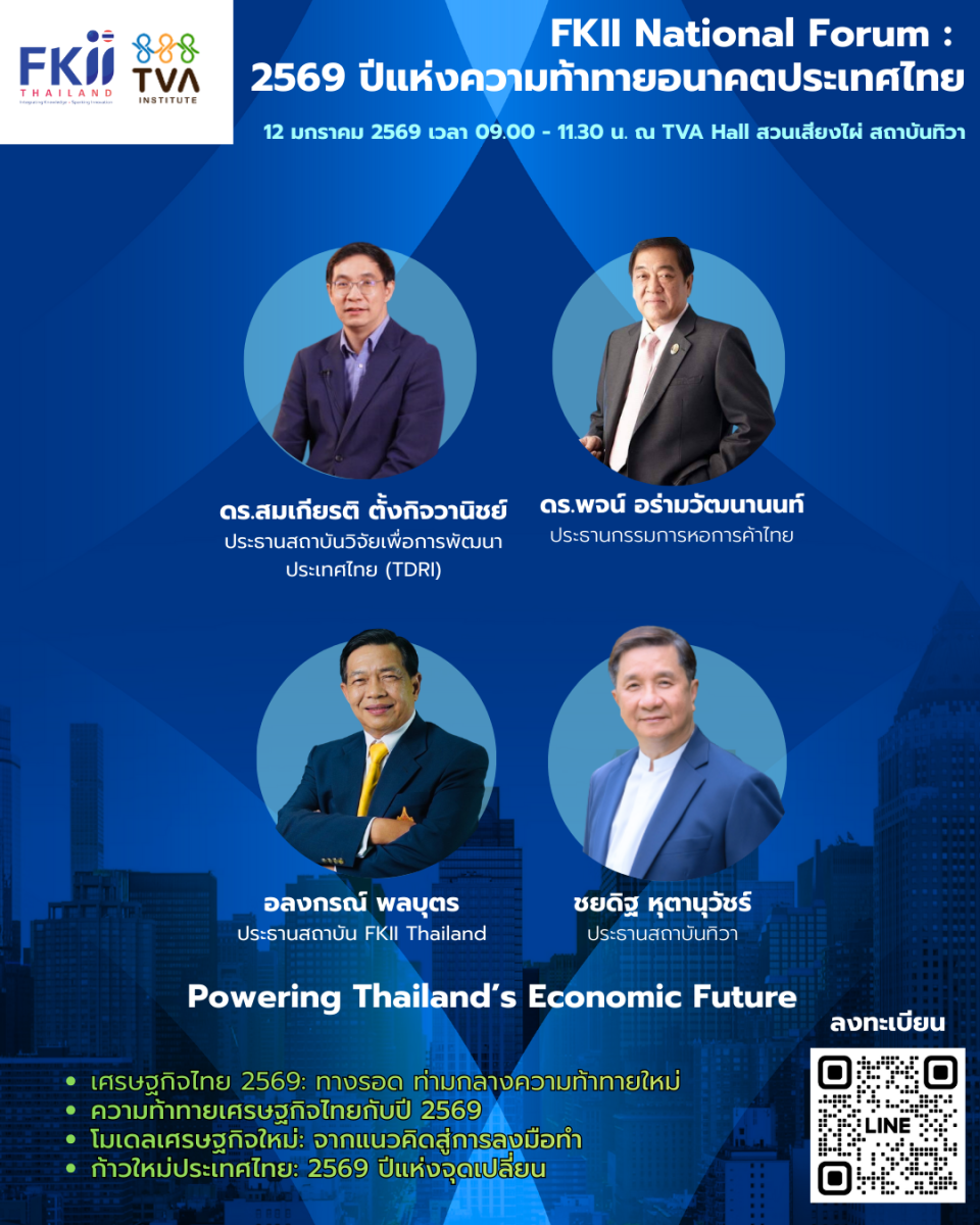 สู่อนาคตประเทศไทยในมุมมอง “ประธานหอการค้า–TDRI–FKII–สถาบันทิวา” สถาบัน FKII Thailand ร่วมกับ สถาบันทิวา (TVA Institute) เตรียมจัดเวทีเสวนาระดับชาติ FKII National Forum ในวันอาทิตย์ที่ 12 มกราคม 2569 เวลา 08.30–11.30 น. ณ TVA Hall สวนเสียงไผ่ สถาบันทิวา ทาวน์อินทาวน์ ภายใต้หัวข้อ