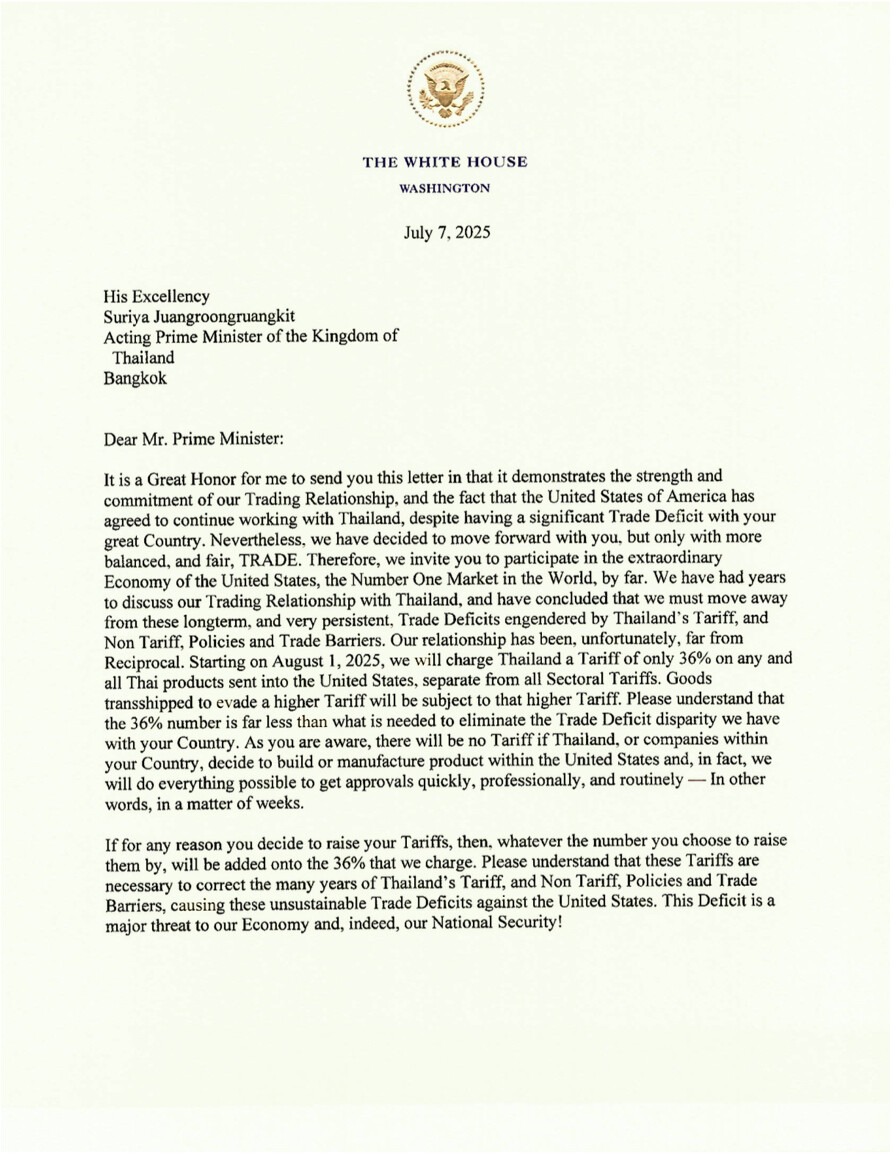 8 กรกฎาคม 2568 ประเทศไทยกำลังเผชิญกับภาษีนำเข้าสหรัฐฯ ในอัตรา 36% สำหรับสินค้าทุกประเภท มีผลบังคับใช้วันที่ 1 สิงหาคม หลังจากประธานาธิบดีโดนัลด์ ทรัมป์ส่งจดหมายแจ้งมาตรการใหม่ในการสู้สงครามการค้าที่รุนแรงขึ้น